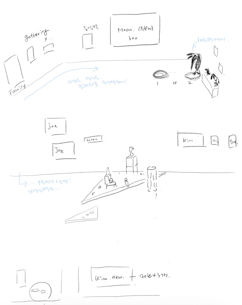 하나로 귀결되는 지배적 메시지를 만들어내는 행위와 기획된 것에 맞추어 정리하고 깎아내고 도려내는 자세에 대한 의문을 가졌다. 미술은 도저히 정답이 없고, 단일한 방향을 가질 수 없고 그래서 나는 계속 길을 잃고 싶었고 자주 길을 잃었던 것 같다. 전시는 영원히 존재할 수 없고, 잠시 여기 머물 뿐이다. 그래서 전시가 구성되고 작품을 담아내는 과정을 되돌아보고 주목했다. 전시를 만들기 위해 마주했던 여러 갈림길과 수많은 과정과 대화가 증발되지 않고 조금은 머무르길 바랐다.
