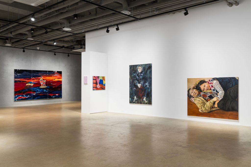 문지영의 작업에 등장하는 인물인 어머니와 동생은 정면을 응시하거나, 얼굴이 지워져 있거나, 배경에 스며 있다. 명확한 결론도 단정된 의미도 없다. 분명하거나 따뜻한 공동체로만 가족은 그려지지 않으며 때로는 감정의 흐름이 유예되거나 절제되는 것처럼 보이기도 한다. 여성에게 돌봄은 종종 운명처럼 주어지는 역할로 받아들여지며, 이에 따라 자기 자신을 뒤로 미루거나 소외시키는 경험으로 이어지기도 한다. 그러나 문지영의 작업은 그러한 구도로부터 거리를 두고 돌봄이 내밀하게 요청되었던 순간들 혹은 감정의 분배가 작동하던 구체적인 장면들을 조심스럽게 되짚는다. 어머니와 동생을 그리면서도 그것이 단편적인 가족 서사나 사랑의 기록으로 귀결되지 않는 이유는 그 감정의 결이 복잡하고 양가적이기 때문이다. 문지영의 작업은 가족을 중심으로 한 자신의 이야기를 다루지만 그 감정은 단순한 사랑의 서사로 귀결되지 않는다. 작가는 밀착과 저항의 이중 구조를 느끼며 사실과 허구를 혼합하는 방식으로 내면적 갈등과 타자와의 관계를 재구성한다. 예를 들어, 이번 신작 <철푸덕>에서는 동생과 노는 장면 속 자신의 얼굴을 붉은 물감으로 범벅된 채 표현한다. 이 붉은 물감은 허구와 사실이 교차하는 내면의 서사를 과감히 드러내는 장치로 작동한다. 또는 자신의 감정에 더욱 집중하는 모습으로 해석할 수 있다. 에서는 병원복에 일반적으로 나염되는 ‘HOSPITAL’이라는 단어 대신 자신의 감정을 반영한 ‘LOVE and HATE’라는 텍스트를 직접 그려 넣어 감정의 상태를 드러낸다. 문지영이 그려내는 서사는 단순한 자기 고백이 아니라 불완전한 서사와 감정의 모호함을 시각적으로 풀어내는 작업으로 하나의 일관된 이야기로 환원되기 어려운 자기 서사의 특징을 보여준다. 이 감정의 이중성을 은폐하지 않고 그 긴장 안에서 자신이 어떻게 구성됐는지를 지속적으로 그리고 끈질기게 분석하는 것이다. 문지영의 작업은 가족, 특히 어머니와 동생이라는 가장 가까운 타자를 바라보는 것으로부터 출발한다. 초기에는 인물뿐 아니라 배경까지 세심히 묘사하며 되도록 구체적으로 현실을 재현하려는 노력이 엿보였다. 그러나 최근작을 보면 화면은 점차 구체적인 서사보다는 감각의 표현적 밀도와 정서적 여운이 강조되고 인물은 남아 있지만 화면 전반에 과감한 붓질이 더해진다. 문지영과 나눈 대화에서 그는 “그림을 그려야 했는데, 그 앞에 있었던 게 가족이었다.”라고 말한 바 있다. 이는 미리 준비된 서사나 담론이 아니라 삶의 긴급성에서 출발한 기록이었다. 작가는 그릴 수밖에 없었고 어머니와 동생을 그렸다. 시간이 지난 지금 문지영은 자신의 이야기에 귀 기울이기 시작했다. 작가는 작업에서 자신을 집중하지만 자신이 중심이 아니라 관계와 감정의 여백 안에서 유동하는 존재로 자리 잡는다. 돌봄과 감정, 가족, 그리고 자기 자신은 복합적인 흐름 속에 놓이며 그 흐름은 종종 정리되지 않은 채 남는다. 따라서 문지영은 자신만의 고백도 누군가의 이야기를 대변하거나 말하는 작업이 아니라 내면을 따라 흐르는 자기 서사의 층위로 볼 수 있다. 작가는 그 층위의 사이에서 자신을 잃어버리지 않기 위해 노력하며 자기 자신과 타자 혹은 나와 당신을 연결하는 또 다른 관계 맺기의 언어로 회화를 지속한다.